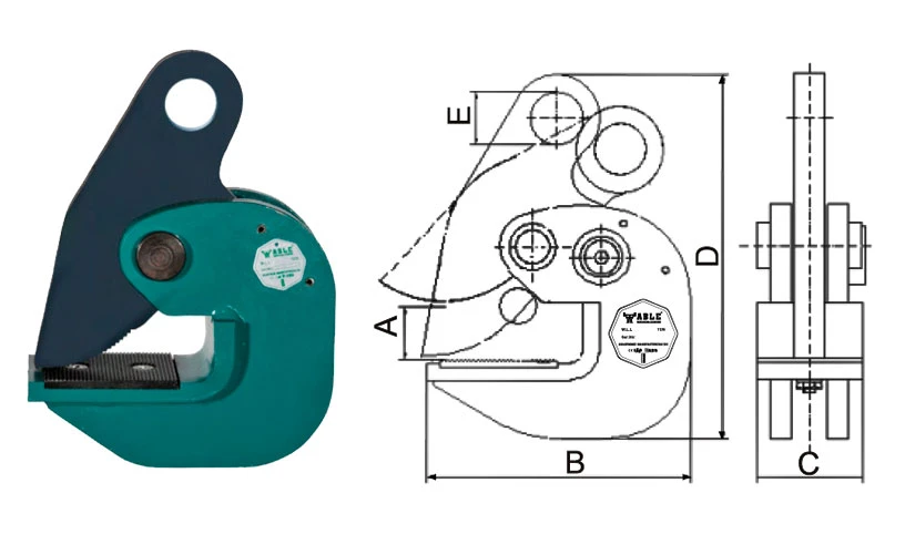| Грузоподъёмность (одиночного захвата/ пары захватов), т | Толщина листа, мм | A | B | C | D | E | Масса, кг |